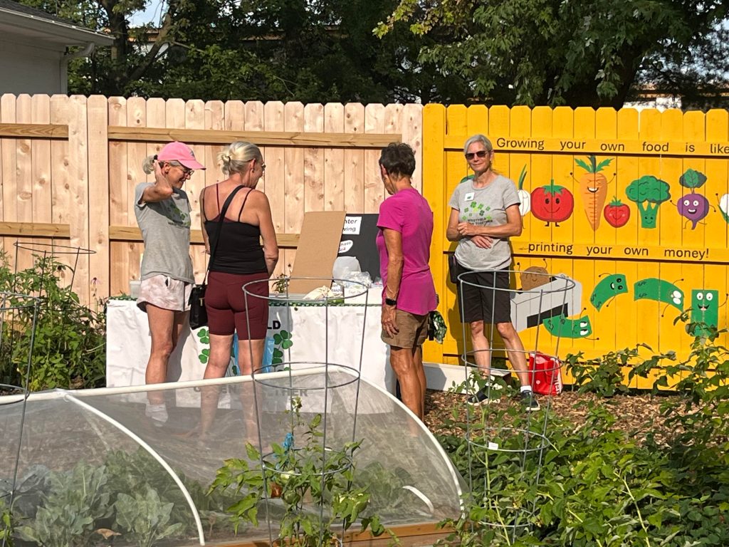 The Wandering Peacock pottery studio on Jersey Street hosted an open house on August 23rd which included refreshments, music, booths selling pottery and yard art, live pottery wheel demonstrations, plein air painting, a live mural painting as well as public tours of the community sharing garden. Here is the WGT table, where we gave away seed packets and educated attendees on winter seed sowing, and the WGT mural: